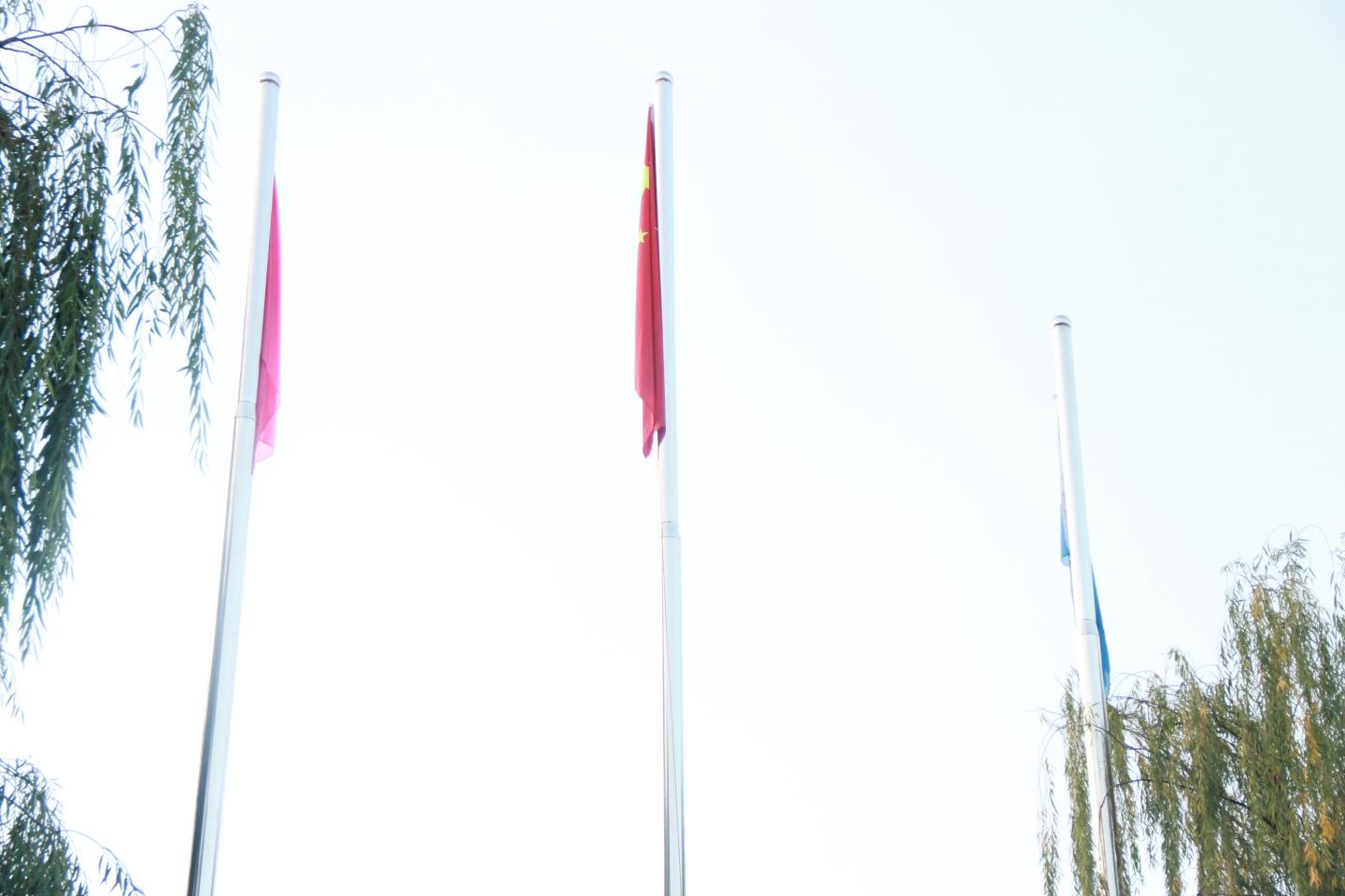 7点5分,校国旗护卫队的旗手们踏着矫健的步伐,护送五星红旗走向升旗台。7点10分,伴着庄严肃穆的国歌,五星红旗在绿茵场边冉冉升起,飘扬在蔚蓝的天空,全体师生面向国旗行注目礼。