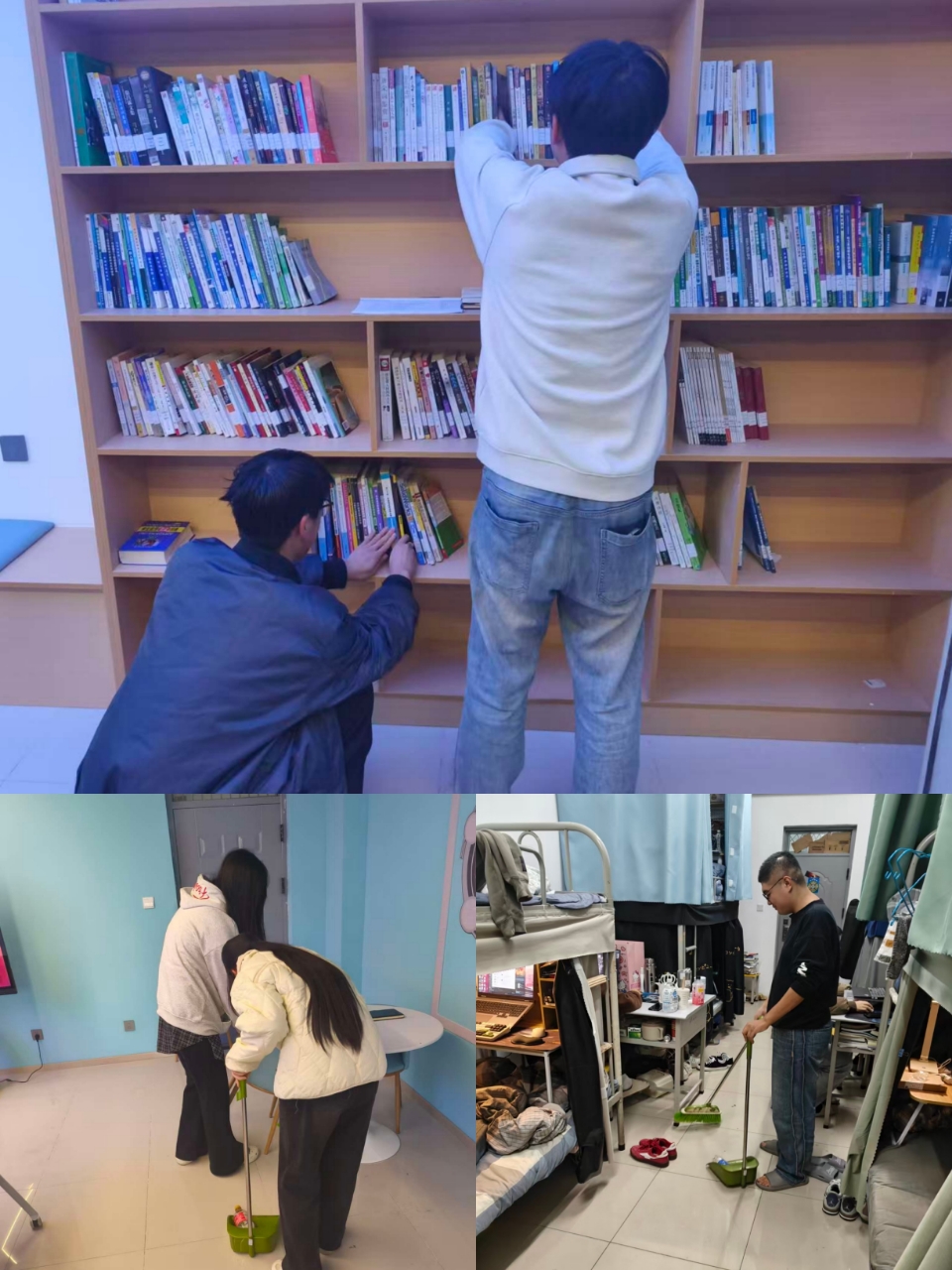 理论宣讲结束后,一次“以劳育德,感恩同行”的实践活动随即展开。受助学生们拿起清扫工具,积极投入到“寓”见“悦”心空间和宿舍公共区域的清洁整理中。同学们有的擦拭门窗桌椅,有的清扫地面,有的整理公共书架,在分工协作中让学习和生活的环境焕然一新。现场气氛热火朝天,一位同学感慨道:“享受了国家的资助政策,现在能通过这样实在的劳动为社区出一份力,感觉特别有意义。” 这堂“行走的”感恩教育课,让大家在汗水中深化了对责任与回馈的理解。