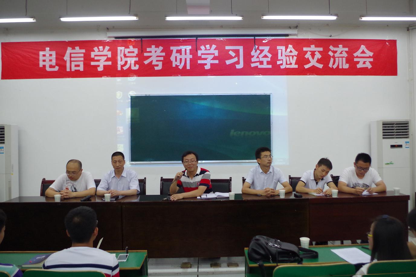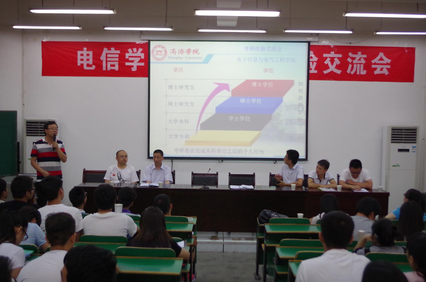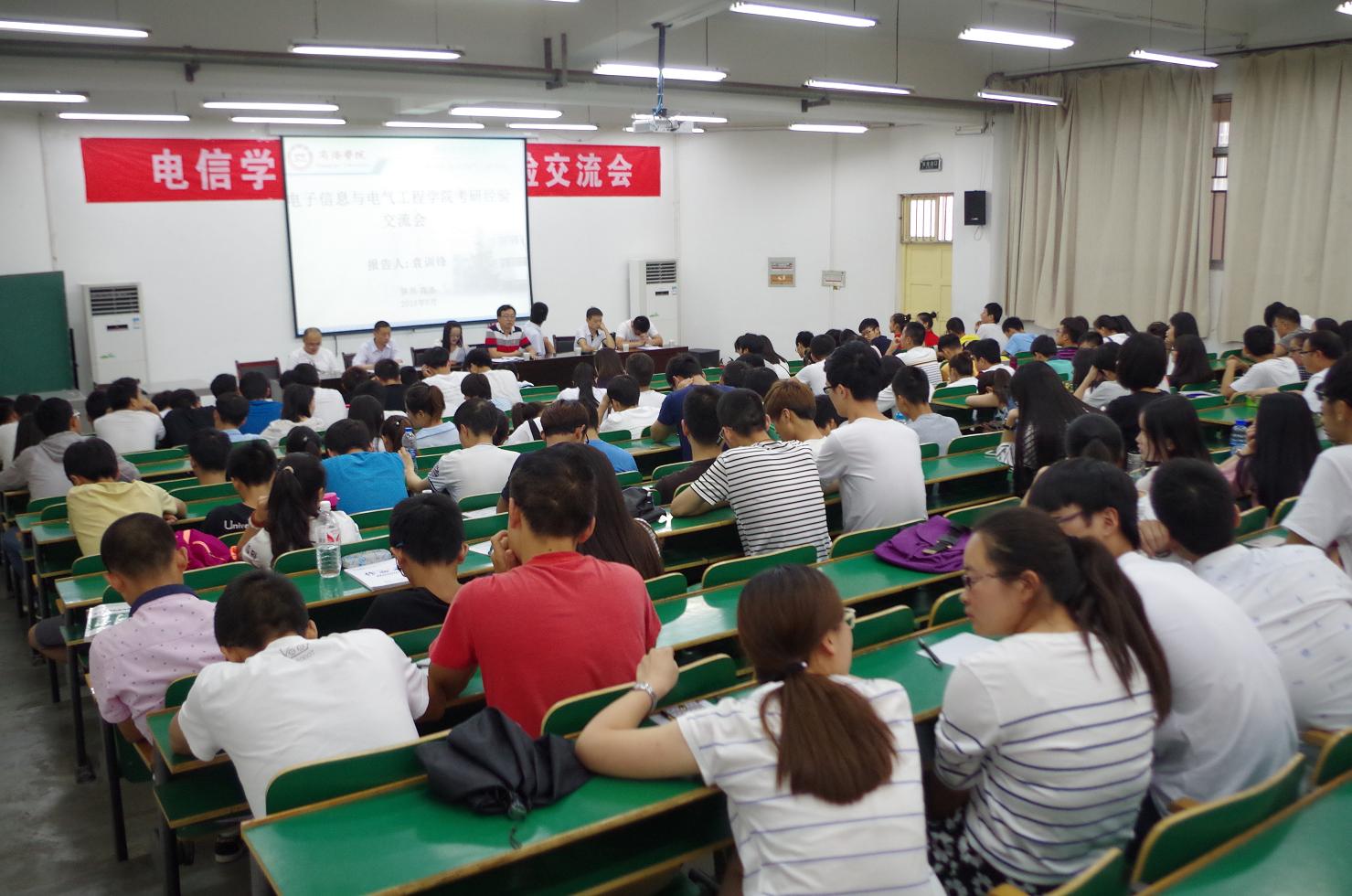 为了解决同学考研准备过程中的问题,激发同学们的学习热情和考研激情,增强准备考研同学的信心和决心,6月24日下午,电子信息与电气工程学院于1号教学楼报告厅一举办了考研学习经验交流会,我院副院长袁训锋,党政办公室主任杨延锋,青年老师杨滨峰、何建强、张商州、张林,优秀考研学生代表宋丹、刘经纬、胡瑞霞等应邀来到现场,为2013级、2014级、2015级有考研意向的同学们分享经验,解答疑问。本次活动由副院长袁训锋博士主持。