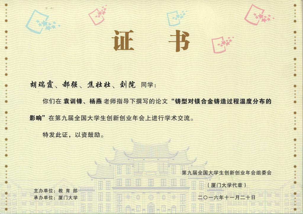 我院胡瑞霞、焦壮壮等同学,在袁训锋、杨燕老师指导下撰写的论文“铸型对镁合金铸造过程温度分布的影响”,入围学术年会。此论文是2015年国家级大学生创新项目“工艺条件对镁合金铸件缺陷分布的影响(201511396717)”的阶段性成果,发表在核心期刊《中国铸造装备与技术》2015年第4期上。物理学2014级焦壮壮在第九届全国大学生创新创业年会上进行学术报告交流,充分展示了国家级大学生创新创业训练计划项目的优秀成果,弘扬了我院学生的创新学术精神,获得与会专家和师生的好评。