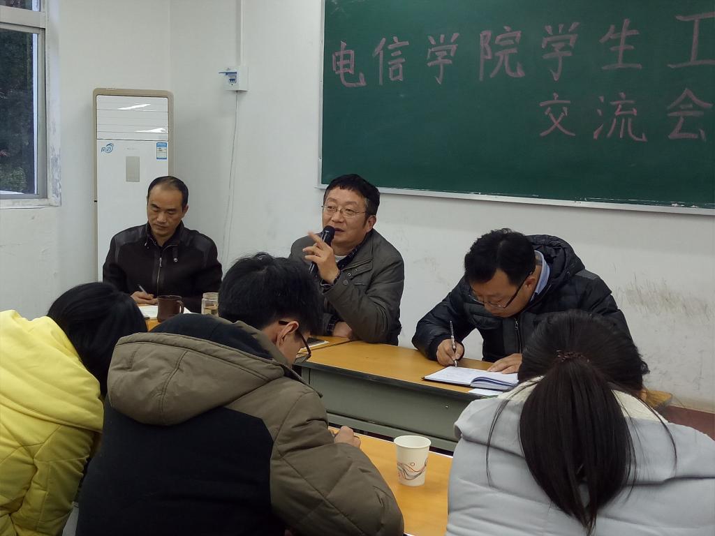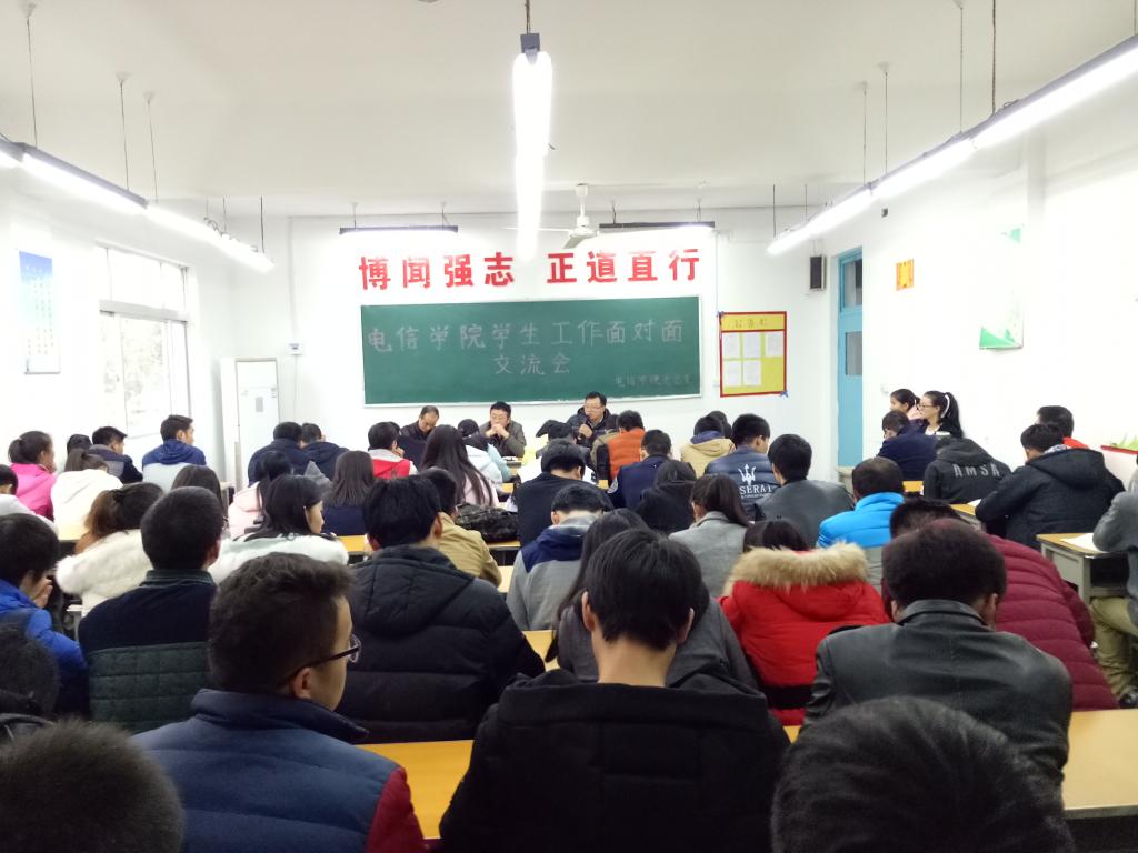 为增强我院教职工与学生之间的交流,了解学生在校的学习、生活状态,切实做好学生工作,全方位为学生服务。电信学院于12月1日下午4时在2-210活动教室举办“学生工作面对面”交流会。我院党总支副书记赵正鑫,副院长李英、袁训锋,各系主任及有关教师与各专业70余名学生代表展开了内容丰富的互动。