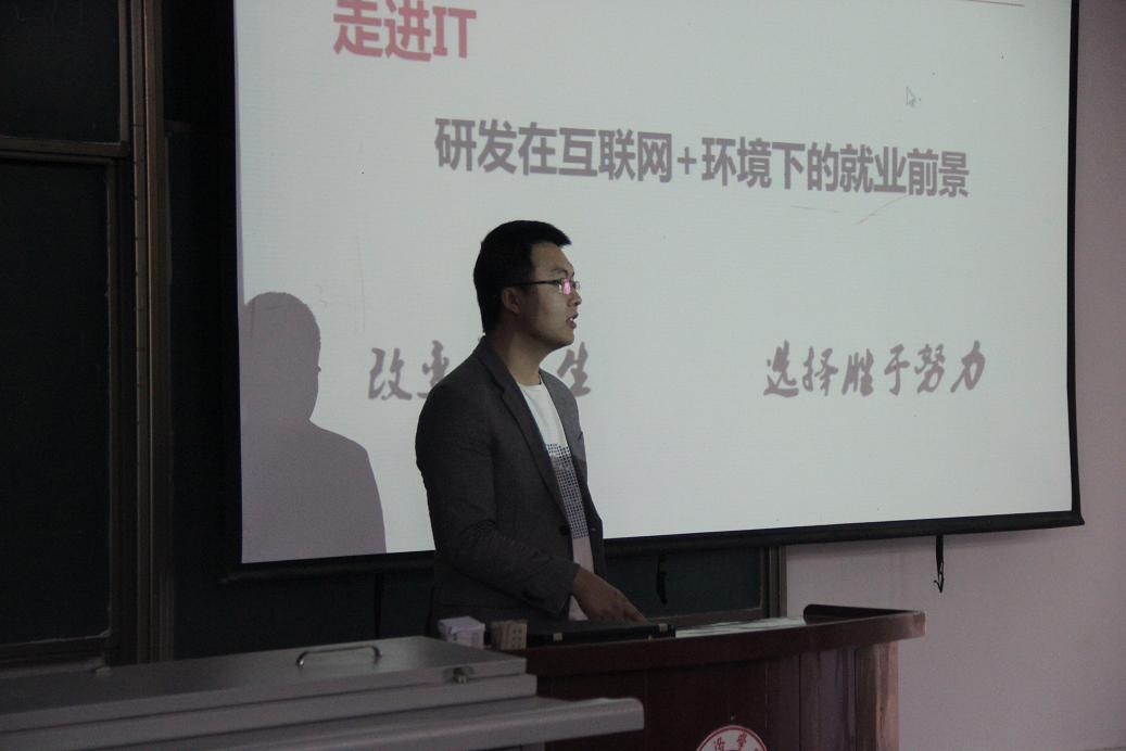 为提高学生的专业技能、实践能力及兼备多元化的能力,从而提高就业竞争力,3月8日下午,由电信学院组织的以“走进IT——研发在互联网+环境下的就业前景”为主题的首场企业进校园活动在我校一号楼多媒体1顺利开展。电子信息与电气工程学院大三近三百名同学共同聆听了此次演讲。